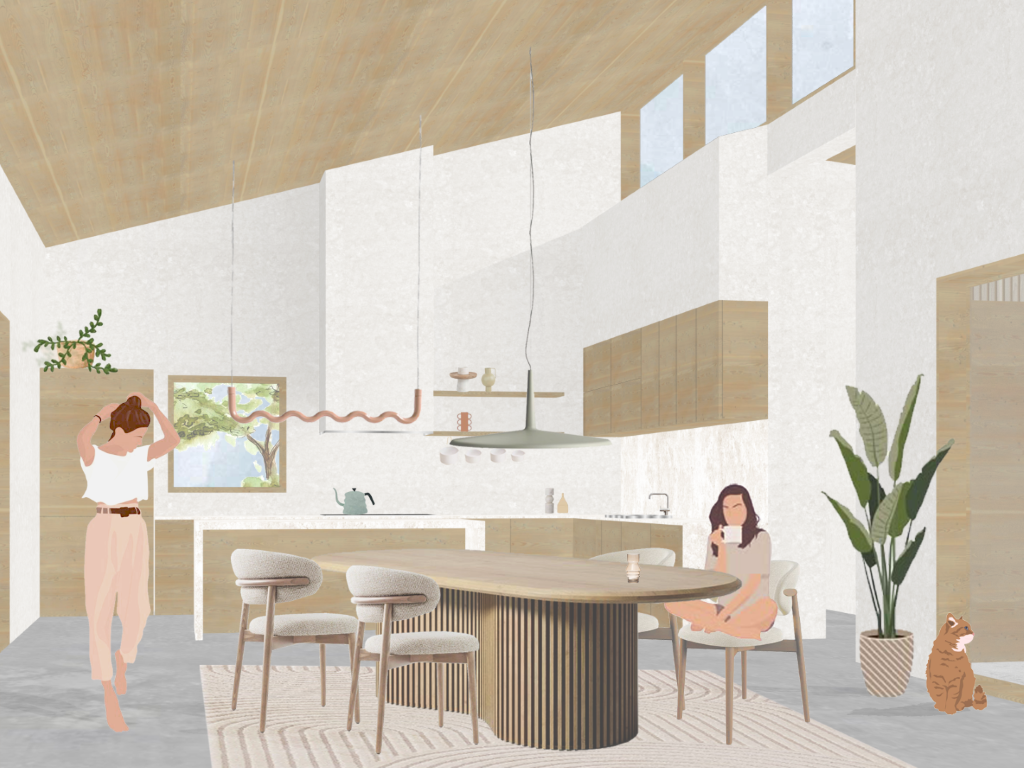 The heart of the house is the kitchen and fireplace, which act as a gathering point and create a strong connection between interior and exterior.