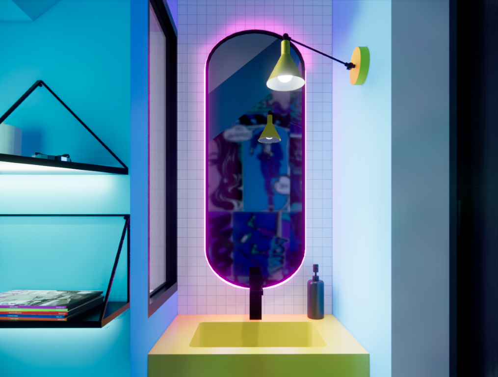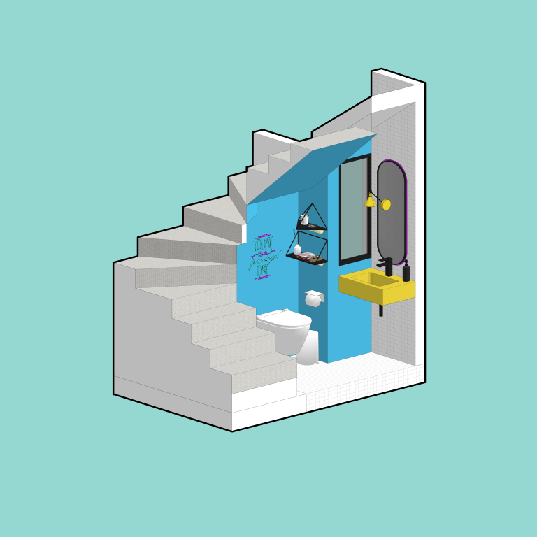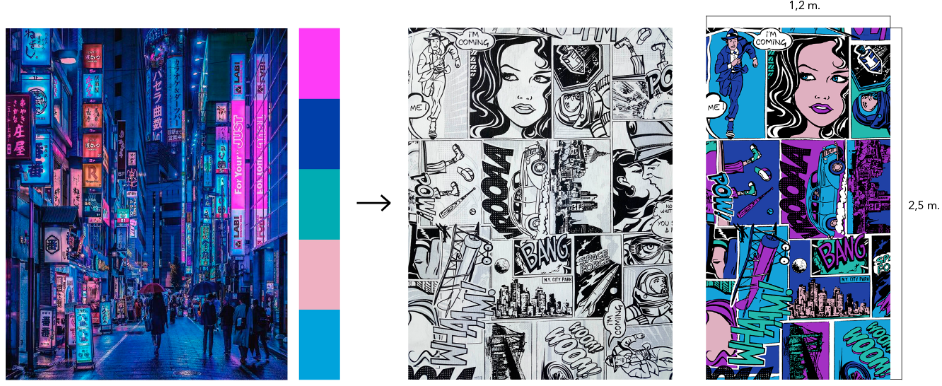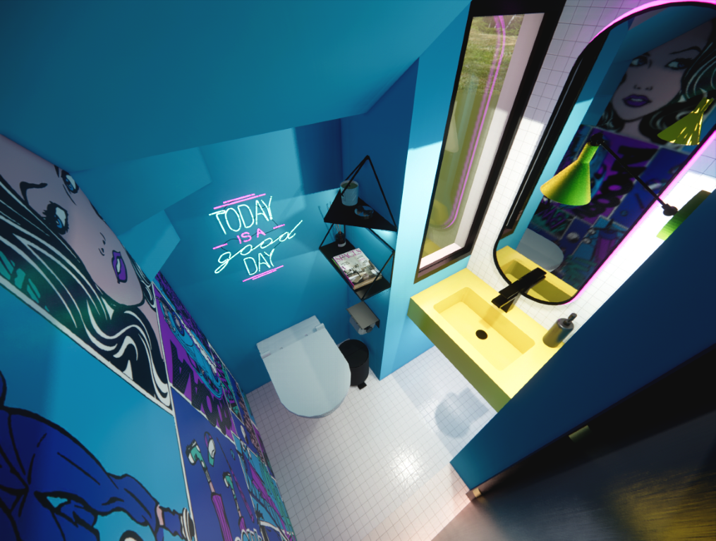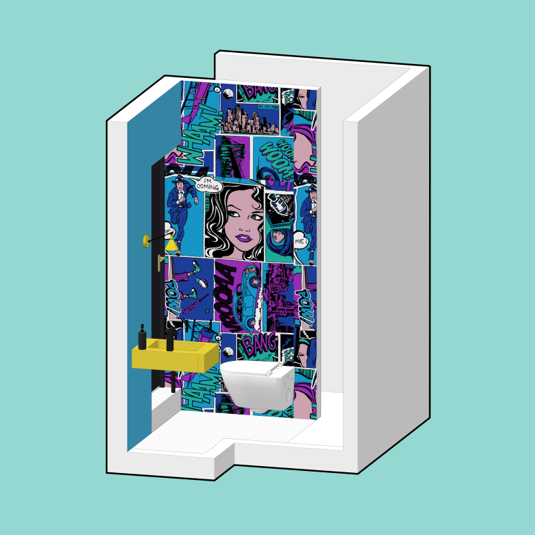 Renovation of a small bathroom inspired by Tokyo’s night streets. The design incorporates a custom wallpaper and a deliberate color palette, with bold black accents that recall comic‑style linework.