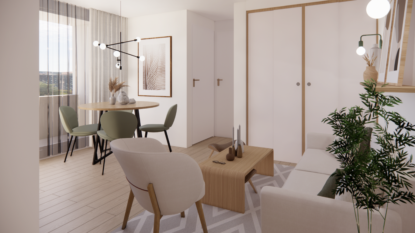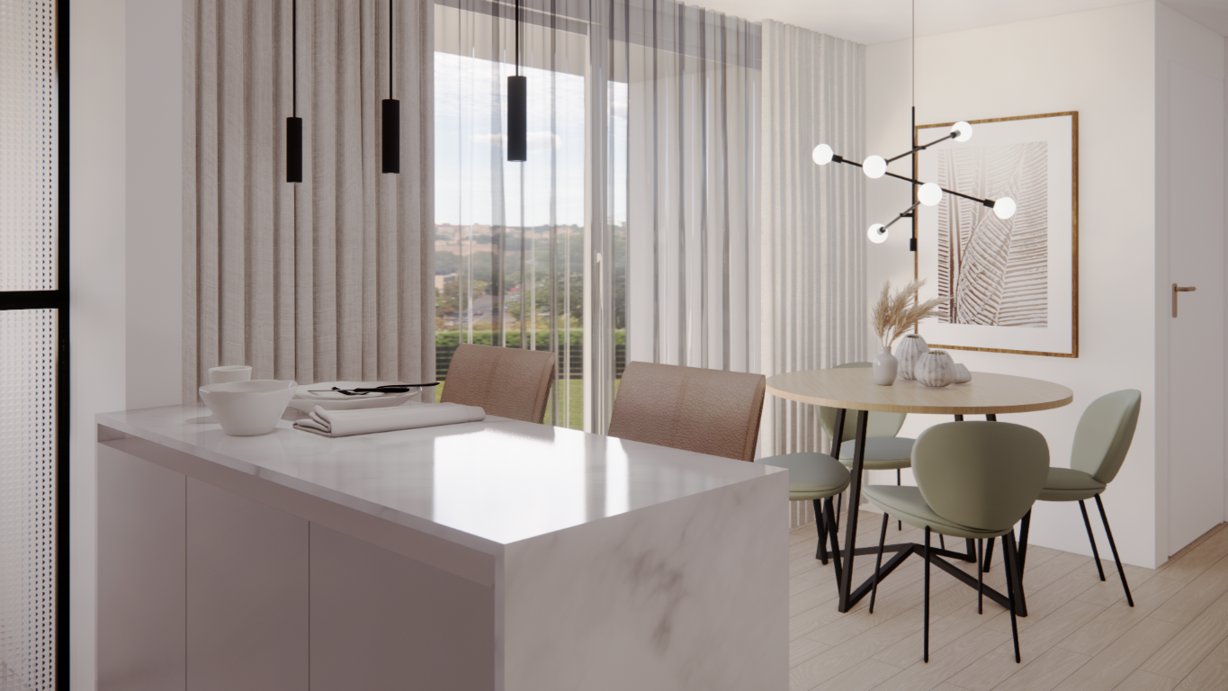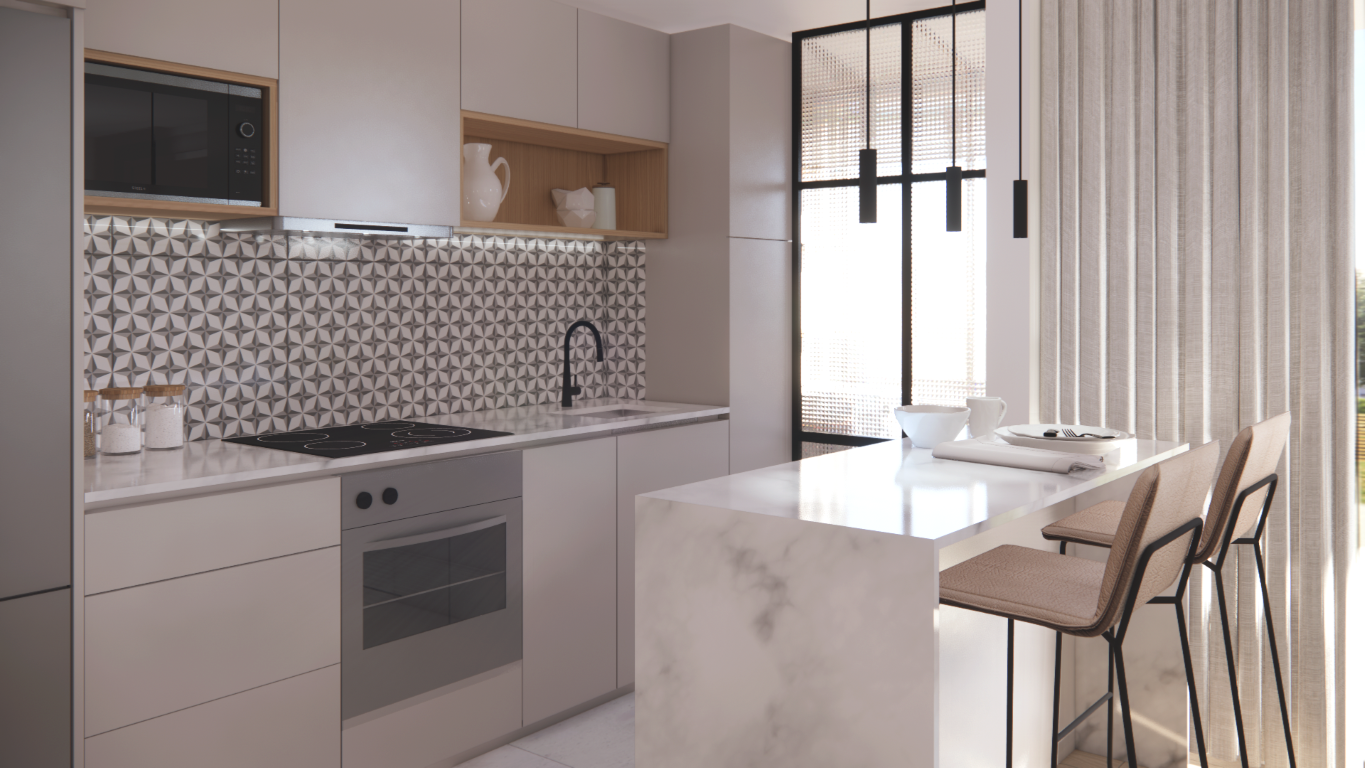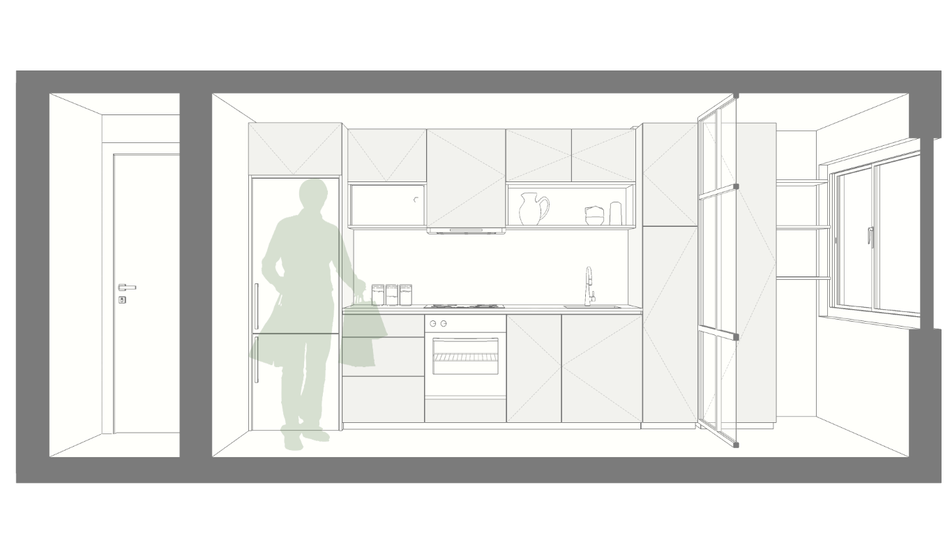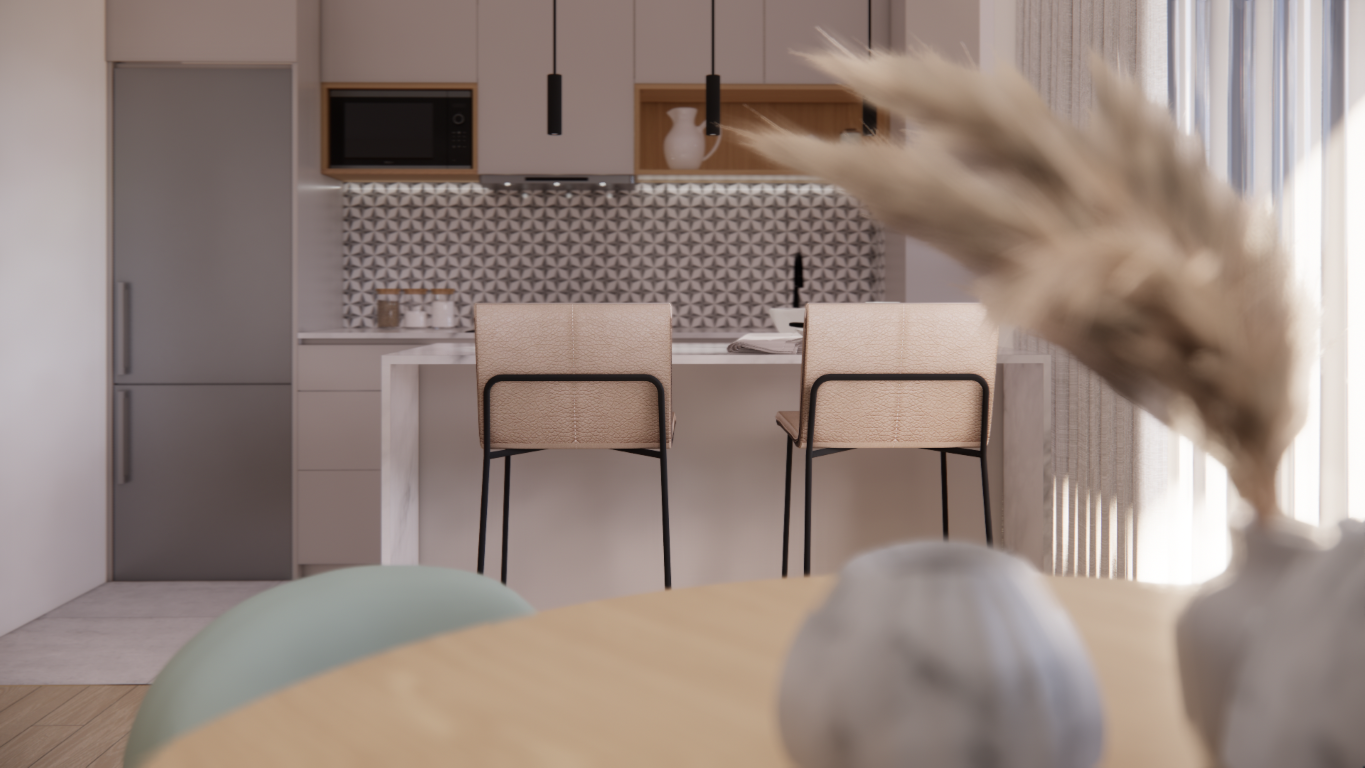 Partial renovation of a 1970s apartment in Santiago, Chile. The proposal opens the kitchen to the living and dining areas to create a larger, brighter space with improved circulation and natural light.