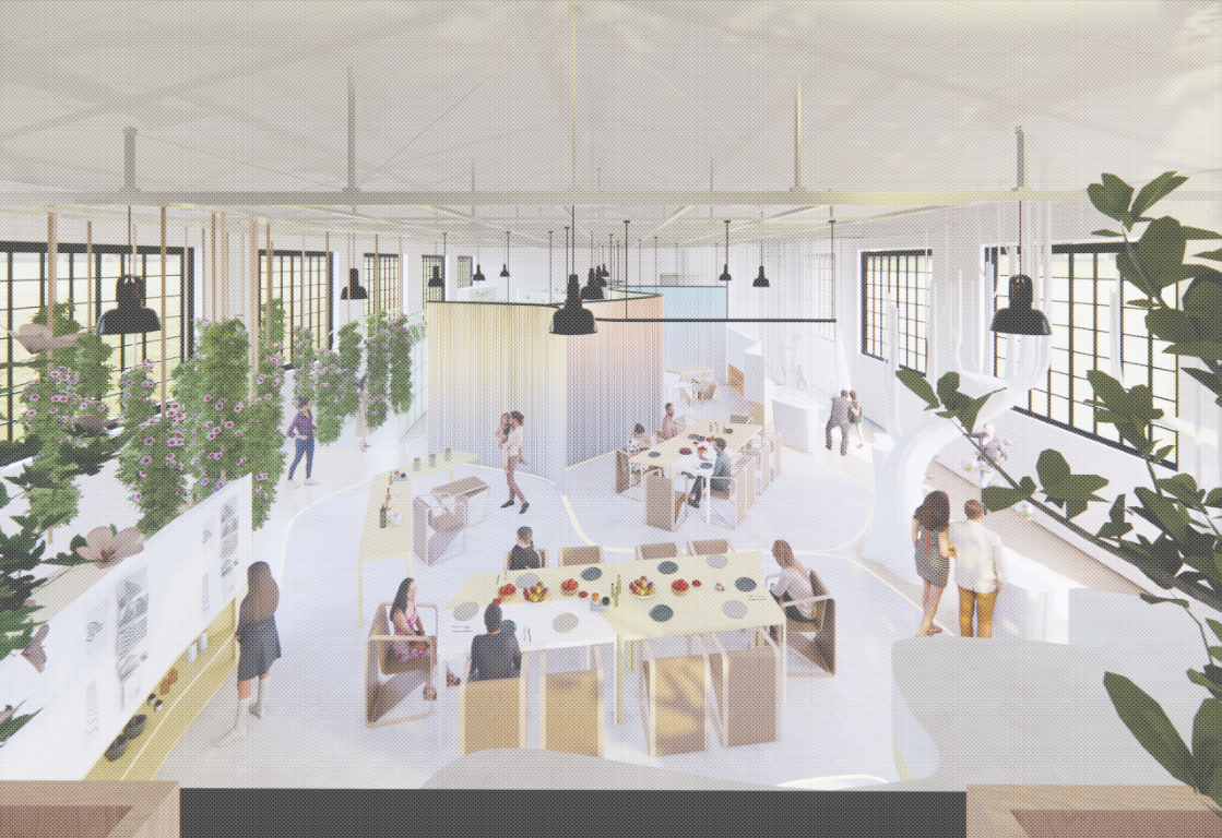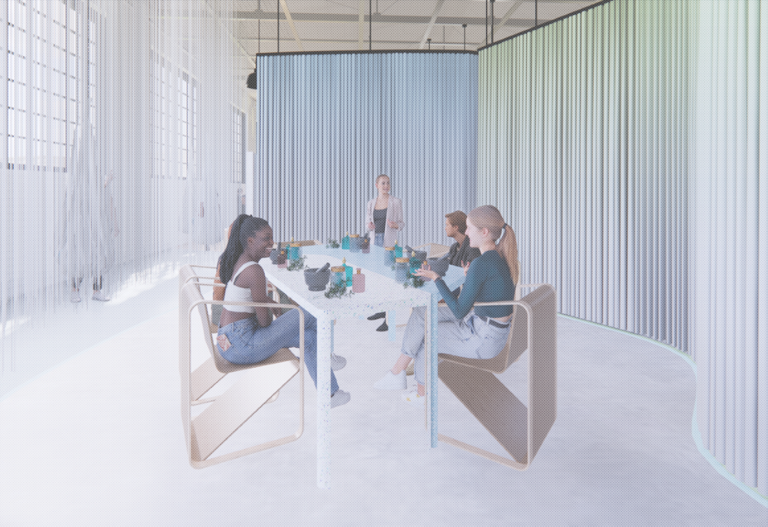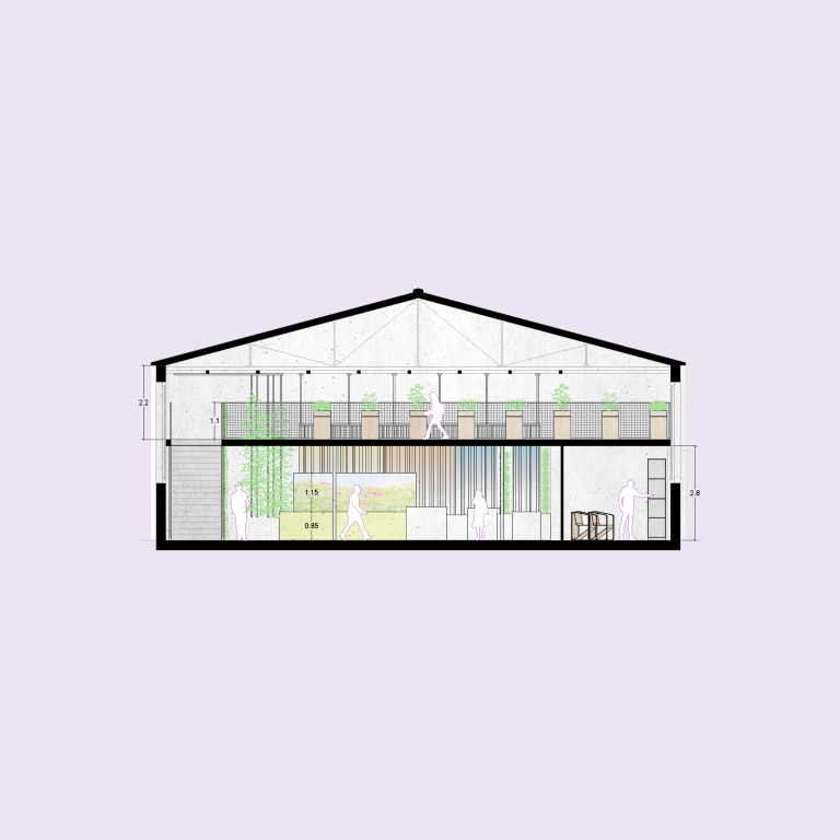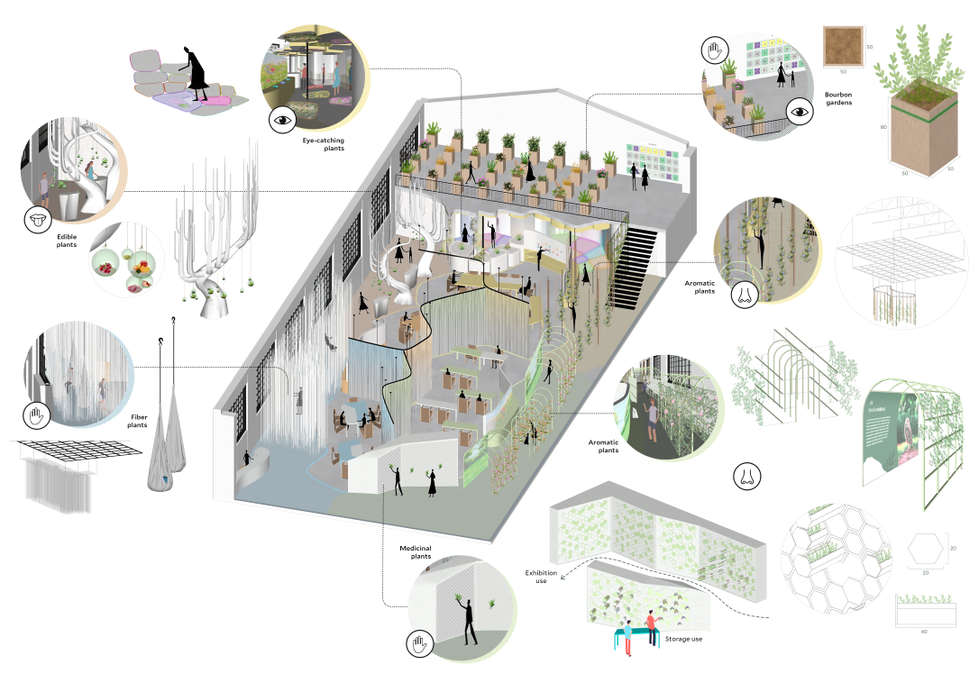 A satellite facility for the Scala Naturae Hotel, housed within a 600 m² industrial warehouse. The project includes workshops for organic products derived from local species, an interactive visitor center, showrooms, and tasting areas featuring products sold and used by the hotel. Visitor interaction is tailored to the characteristics of each species: aromatic (smell), edible (taste), and textile (touch). To support this concept, the historic Bourbon orchards are restored and cultivated, providing raw materials for production while simultaneously fostering local tourism.